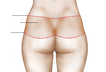 • 1ère étape : le chirurgien retire la peau en excès au niveau du haut des fesses et des flancs ce qui permet en même temps de remonter et de regalber les fesses.